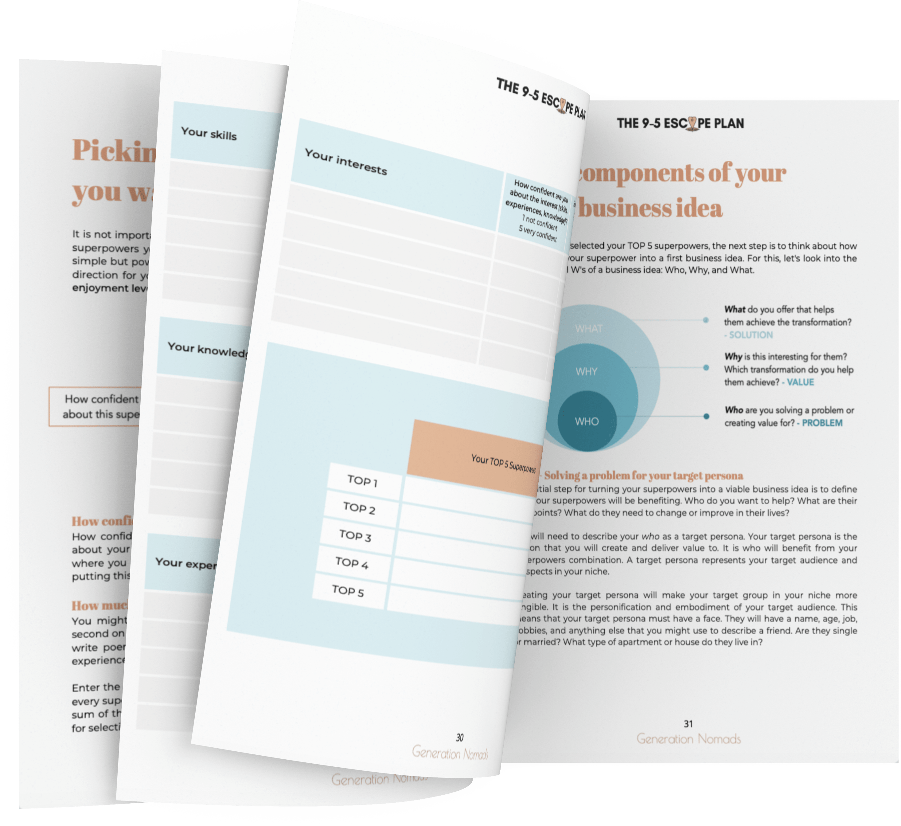 On GenerationNomads.com, they have garnered a monthly readership of 15,000 from over 170 countries. Their Freedom Framework is used to teach millennials how to design and reach a freedom lifestyle. In The 9-5 Escape Plan program, they help their clients create and acquire passive income assets.